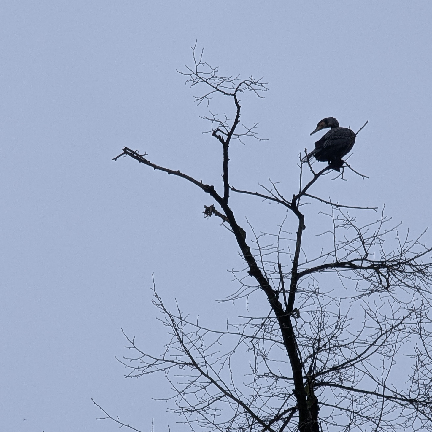 For one thing, although cormorants are thoroughly skilful divers, navigating the dark depths of bodies of water to hunt for fish with ease, this month I've seen them just as often in high places, like this one in the impossibly slender topmost branches of a tree in a nearby park: